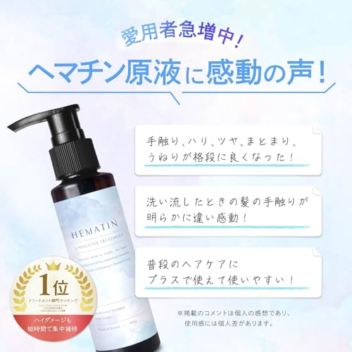 特に、髪のハリやコシの低下に悩む方に適したアイテムで、ヘマチン100%の原液はシンプルかつ効果的なケアが可能です。