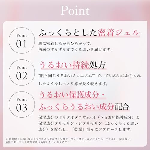 さらに『肌と同じうるおいメカニズム』を参考にした成分設計で、角層に密着したジェルが潤いを長時間にわたって持続させます。