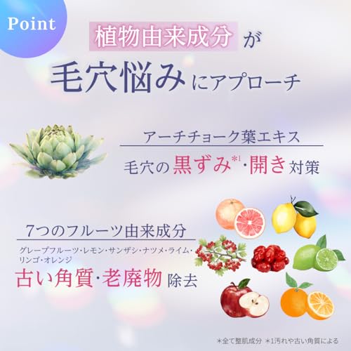 また、植物由来のアーチチョーク葉エキスが毛穴の引き締めをサポートし、汚れの再付着を防ぐ効果が期待されています。