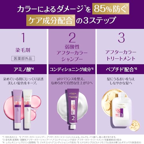 ロレアルパリの技術を活かした処方により、染めた直後の自然な芋栗色が長く持続するとされています。