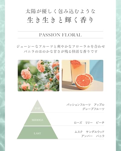 ジューシーなフルーツと爽やかなフローラルの香りに、バニラの甘さがほのかに残る独特の“PASSION FLORAL”フレグランスです。