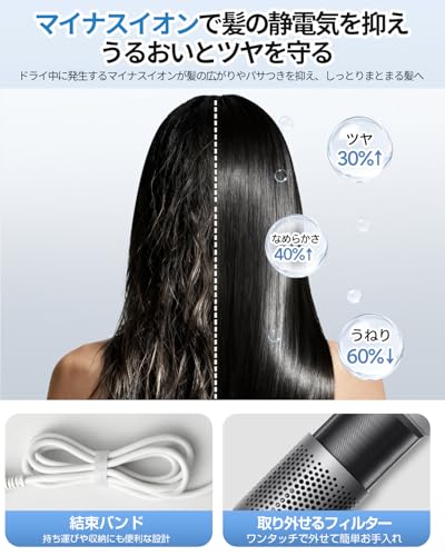 また、高濃度マイナスイオンを均一に放出し、静電気を抑えながら髪のツヤと潤いを守る効果も確認されています。